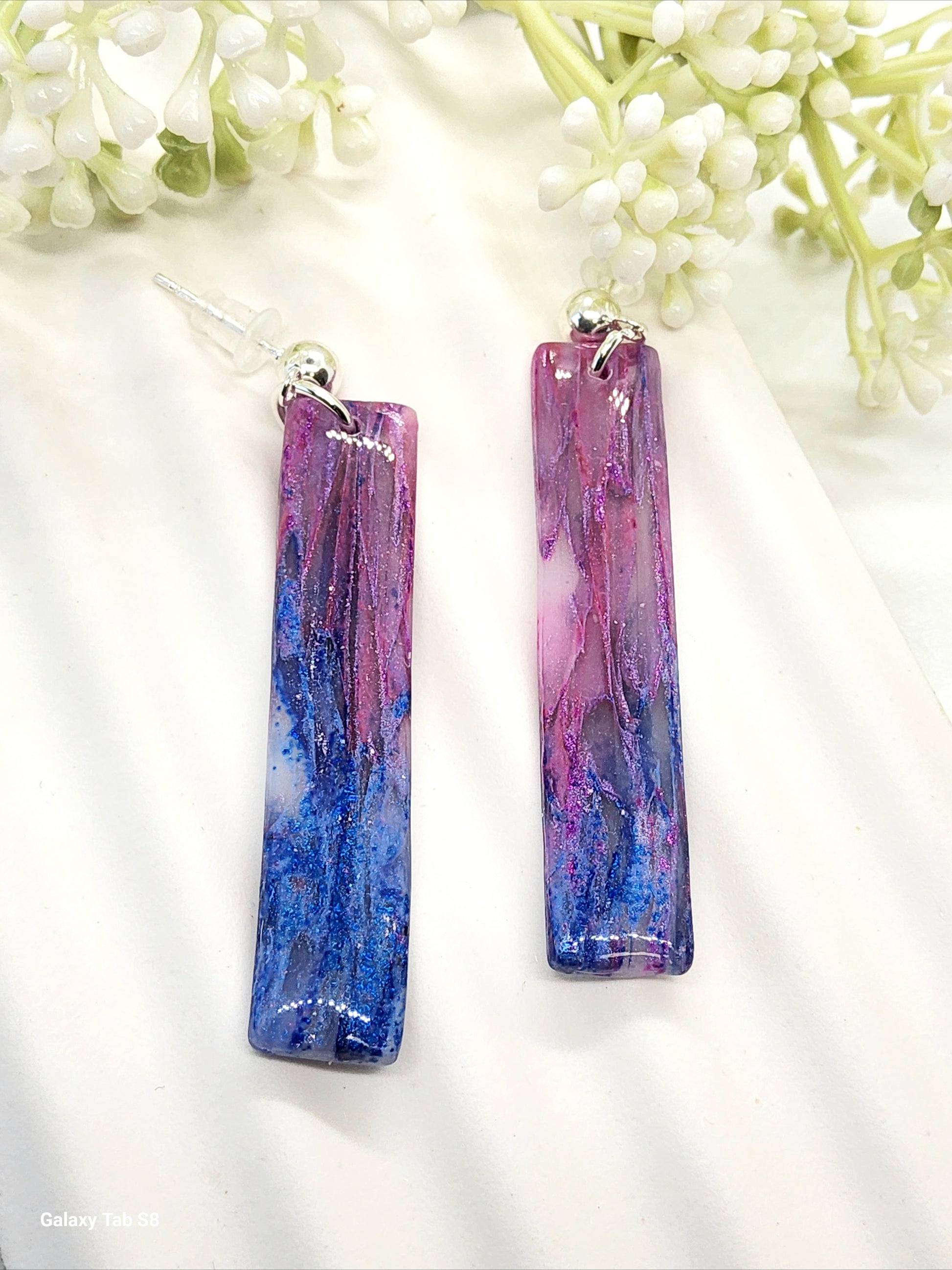 Shimmering bright blue and pink bar earrings with a unique fractured marbled pattern. The resin topcoat adds a glass like look and feel and highlights the marbled effect.