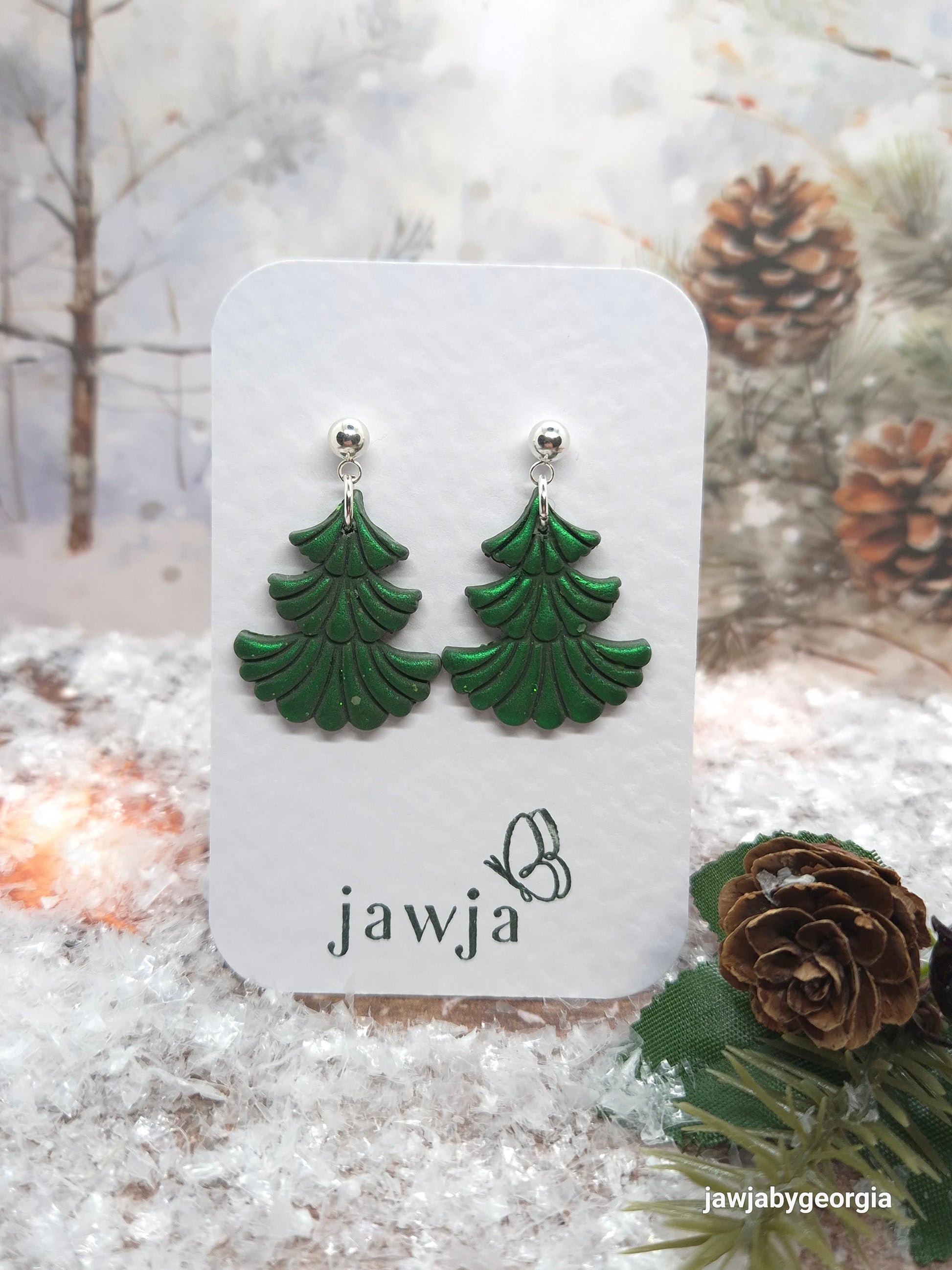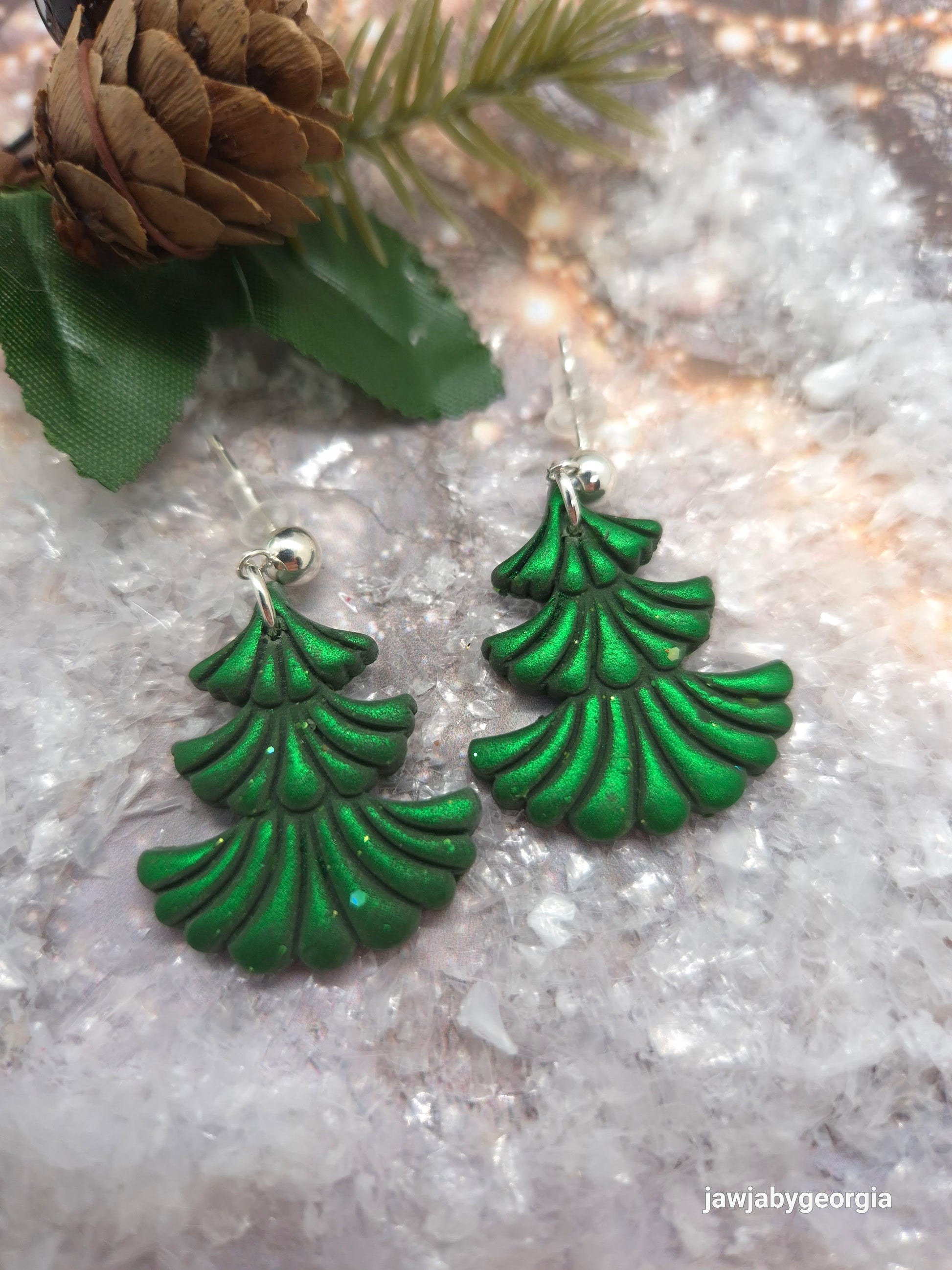 GREEN METALLIC CHRISTMAS TREE POLYMER CLAY EARRINGS