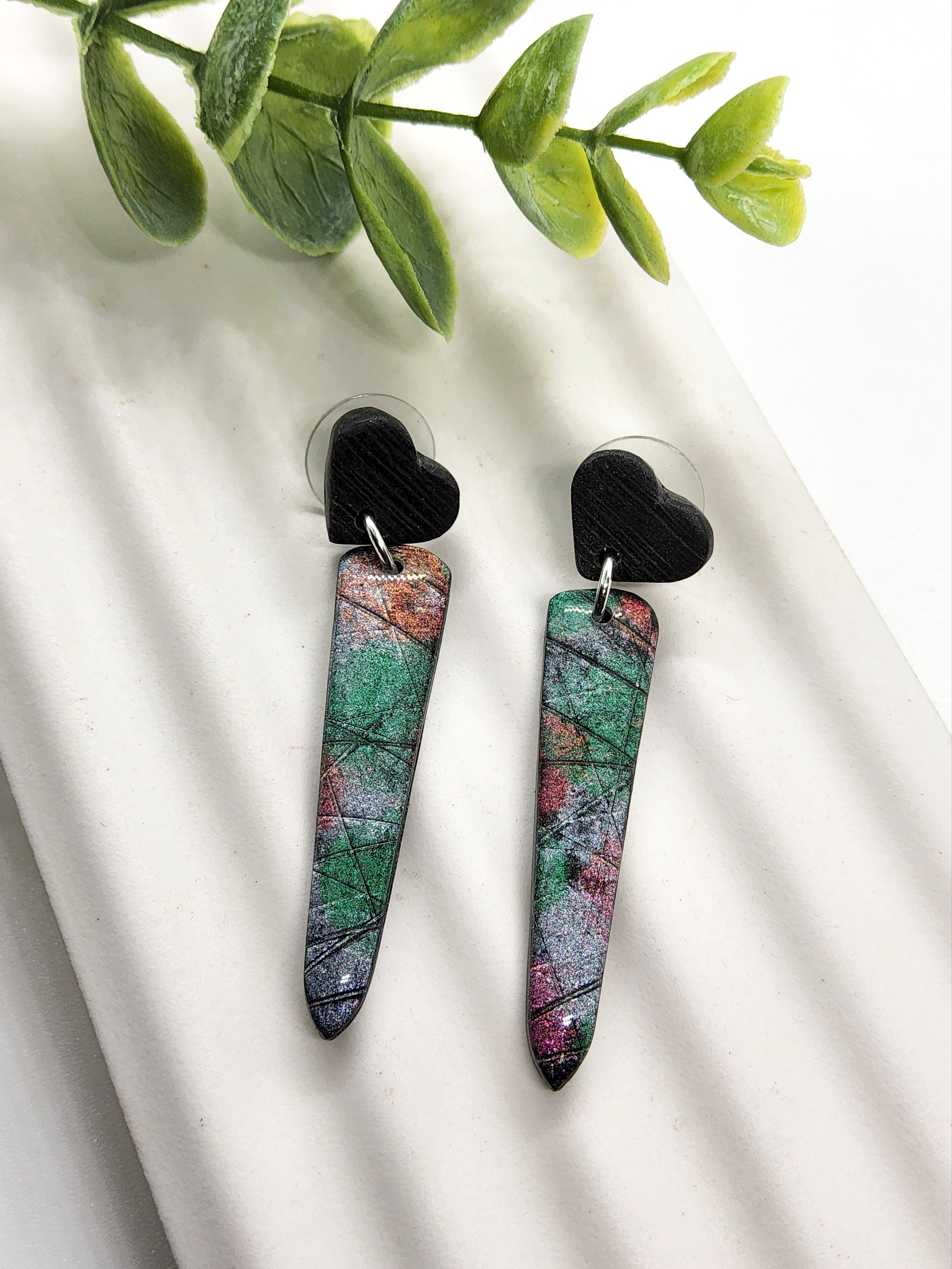 Black textured hearts above an iridescent, jewel coloured tapered bead in shades of red, green and white (depending on how the light reflects). They have a resin topcoat which brings out the colours and adds a glass like look and feel.