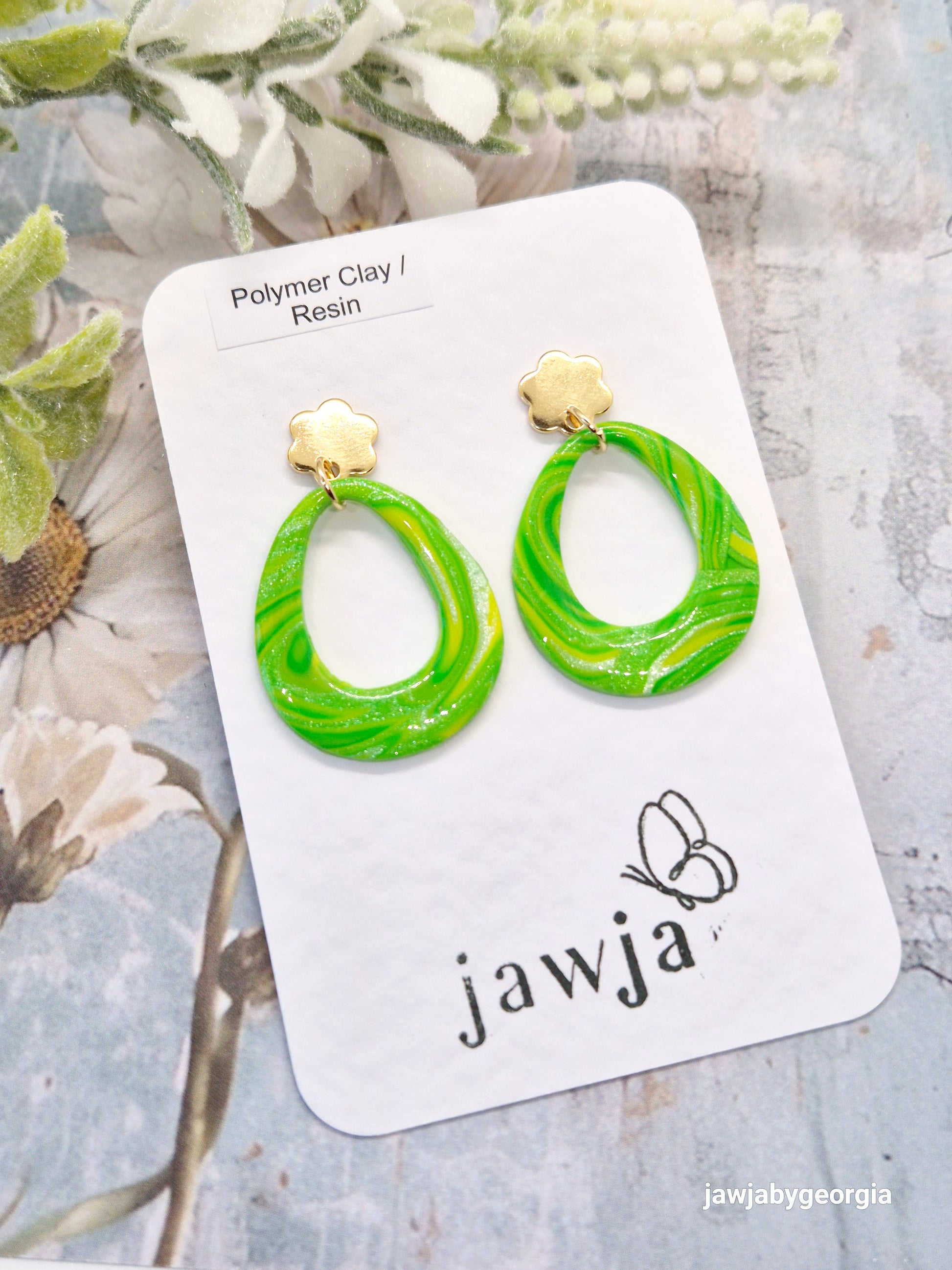 Open teardrop shape with a beautiful marbled pattern in shades of lime green, yellow, and hints of pearlescent white. The resin coating gives them a smooth, shiny finish.