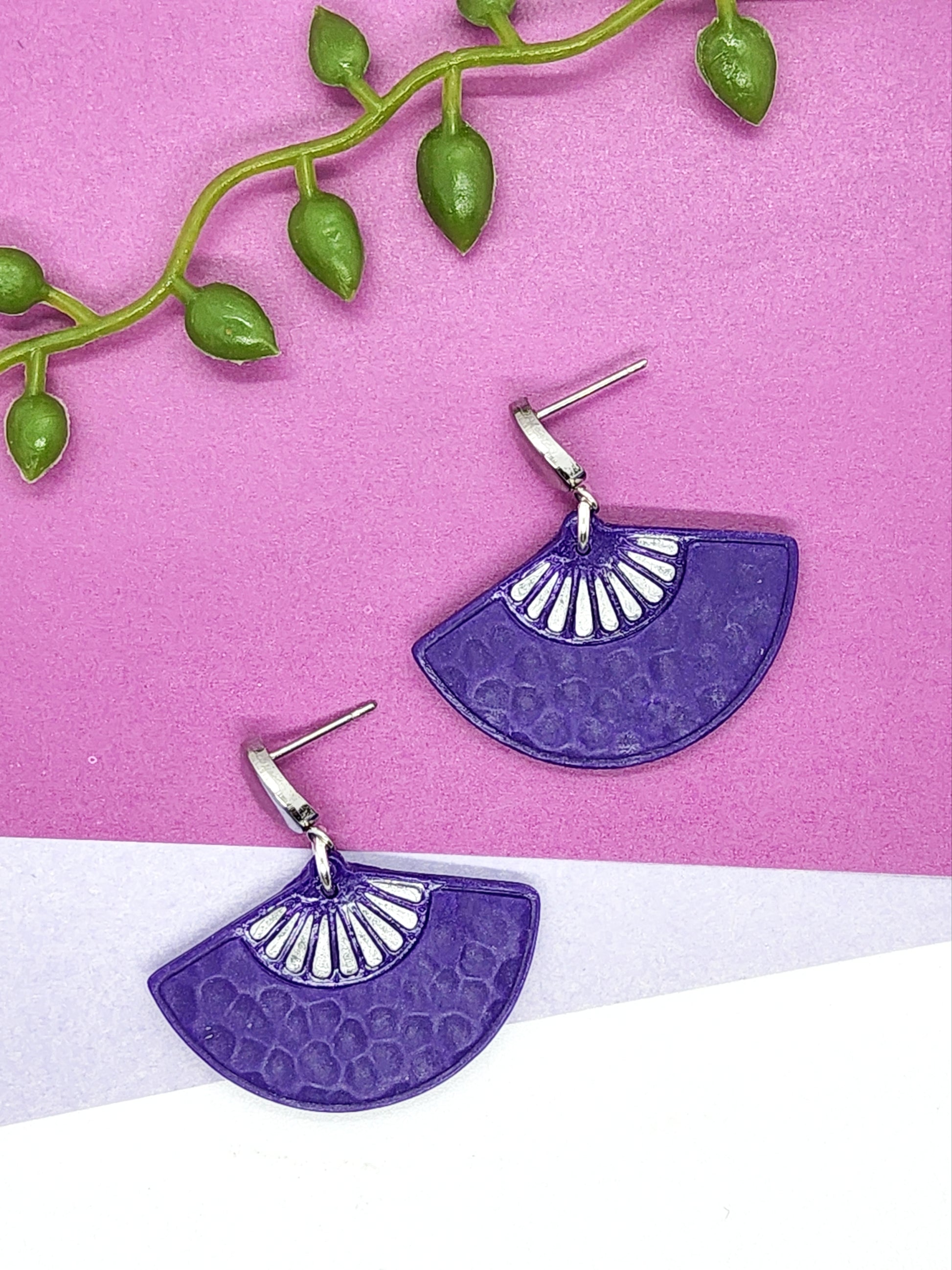 Add a bold pop of colour to your look with these purple polymer clay fan earrings with a hammered texture and silver embellishment.