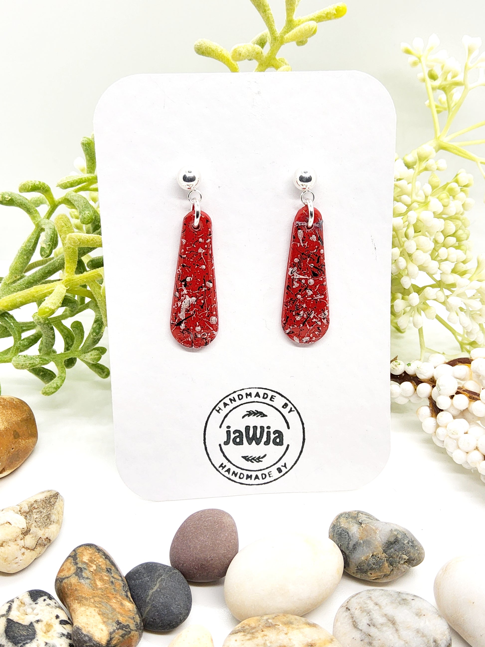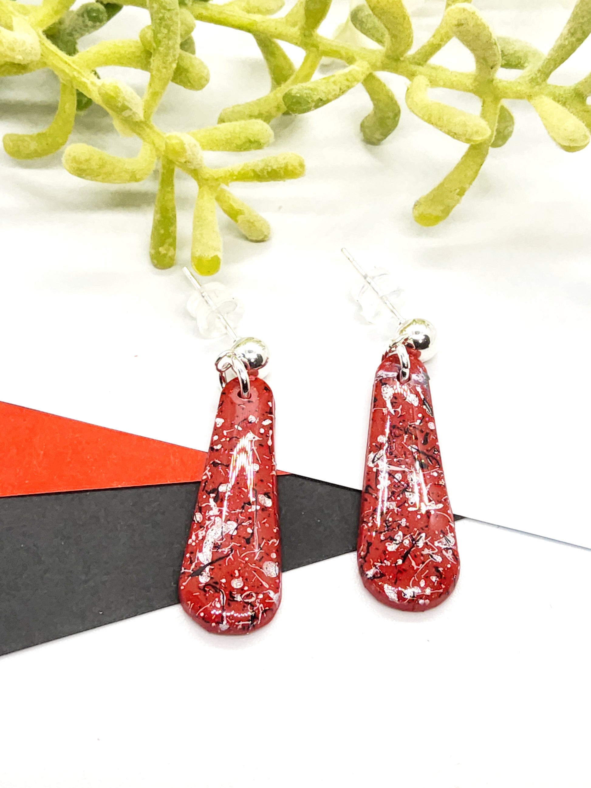 A bold, vibrant red with splatters of black and silvery white in a teardrop shape with a glossy resin coating which adds depth and a glass like sheen.