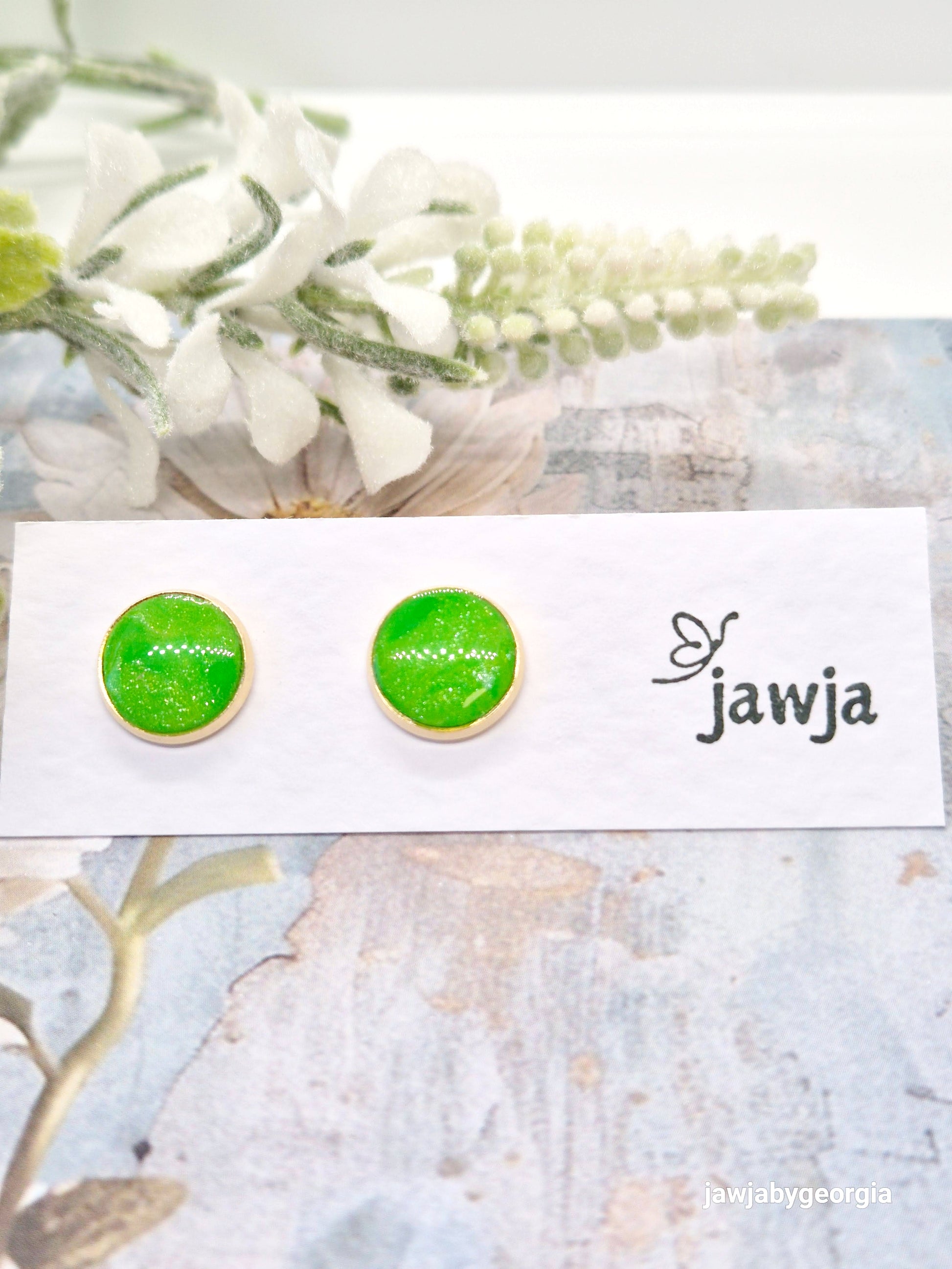 Shimmering green stud earrings within a gold bezel. The 4esin top coat brings out the shimmer and vibrant green, creating a glass like look and feel.