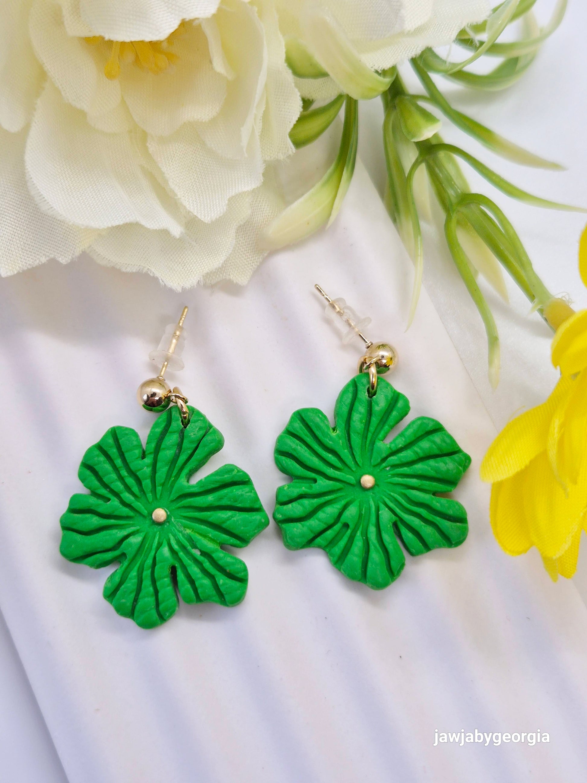 Stunning green tropical leaf shapes with deep indentations and a gold centre. The bold green color and organic leaf design make these earrings vibrant and eye-catching.